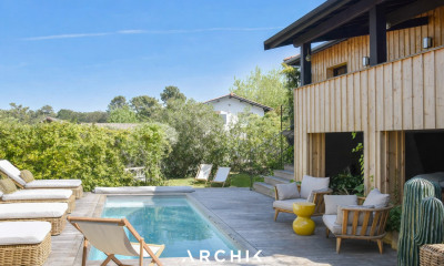 Originally built in the 1950s, this house was recently redesigned and renovated by interior designer Fabien Aucourt-Zulli of Vendôme Edition. He skillfully highlighted the generous proportions, emphasized by high ceilings and exposed beams, lending the space a warm and authentic atmosphere. Natural materials, the omnipresent wood, and soft hues create an interior of relaxed elegance. The open-plan kitchen and dining area, seamlessly integrated with the living room, open onto a covered terrace overlooking the swimming pool, an extension of the living space, ideal for enjoying the outdoors in every season. Two bedrooms and two bathrooms with clean lines, as well as a laundry room, complete this level. A third bedroom with an en-suite bathroom is located upstairs. The fourth bedroom, like a suite, is independent and accessible only from the garden, offering complete privacy. The wooden terraces, the swimming pool, and the landscaped garden featuring local species create an intimate and tranquil setting.