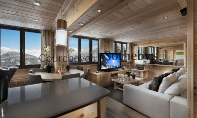 The Le Chamois apartment, with an area of approximately 250m², is located in the Chalet Chasseforêt, situated in the prestigious Hameau de Bellecôte, a private residence consisting of 12 chalets with a caretaker. Nestled in the heart of the forest, ideally located on the Cospillot slope, it features its own ski room with ski-in/ski-out access, as well as a Jacuzzi. It comprises 5 bedrooms, each with ensuite bathrooms, fully equipped with all modern comforts: safe, wifi, TV, music system, Sonos, a separate fully equipped kitchen, and a living room with a fireplace. In a peaceful and majestic setting, Le Chamois can accommodate up to 10 people. A balcony, garage, and parking space complete the amenities.