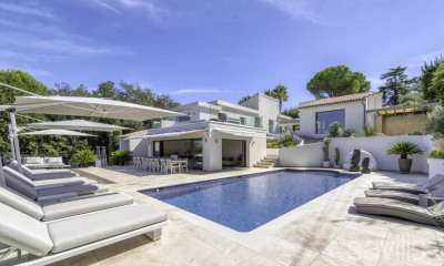 Located in the heart of Cap d’Antibes, The Palm is a refined private estate offering serenity, space, and timeless Riviera charm. Right above the sea, this fully detached villa provides an exceptional setting for summer living on the Côte d’Azur. Set within 1,650 m² of private landscaped grounds with beautiful swimming pool, the property includes a main villa of approximately 410 m² designed for comfort and elegance. On the main floor, guests are welcomed through a grand entrance hall that opens into a spacious living and dining area filled with natural light. The fully equipped kitchen is modern and functional, with direct access to the garden. This level also includes a large master bedroom suite with dressing room, en-suite shower and WC, as well as a second bedroom with en-suite bathroom. A guest WC and private study complete this floor. Upstairs, a third en-suite bedroom opens onto a beautiful rooftop terrace — a peaceful space with open views, ideal for sunbathing or sunset cocktails. On the garden level, three more bedrooms each feature private bath or shower rooms, alongside a separate walk-in dressing room, laundry room and storage cellar. A fully independent service apartment offers two bedrooms, a living room with open kitchen, and two shower rooms with WCs — perfect for live-in staff or additional guests. Just few minutes from sandy beaches and Antibes town center, The Palm is ideally positioned to enjoy all the region has to offer.