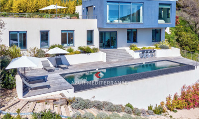Stunning Contemporary Villa with Breathtaking Sea Views in Eze bord de mer. This exceptional contemporary villa is located in a dominant position in Eze, offering unobstructed panoramic sea views. Situated just steps from the Mediterranean Sea, this property combines modern luxury with a tranquil atmosphere, ideal for those seeking the ultimate in Riviera living. Built across 3 levels, the villa boasts a total of 475 m² of living space, including the main house, garages, basement, pool-house, and spacious terraces. Key Features: The villa features 4 bright bedrooms, each with its own en-suite bathroom, a large double living room, a study, a dining room, and a fully equipped open-plan kitchen that opens onto the large terrace, perfect for outdoor dining and entertaining. The design of the villa maximizes natural light, with numerous bay windows in every room that provide breathtaking views of the Mediterranean Sea, creating a serene and relaxing environment. Outdoor Space: The property sits on 1000 m² of meticulously landscaped grounds, offering a perfect blend of private outdoor space. The infinity pool is complemented by a pool-house and a fully equipped summer kitchen, ideal for enjoying the outdoor lifestyle. The garden also features a playground area with a dining space, making it perfect for family gatherings. Additional Features: parking space for multiple cars Multiple spacious terraces for outdoor living Infinity pool with pool-house and summer kitchen Large, landscaped garden with playground and dining area Stunning sea views from every room This property offers a rare opportunity to live in one of the most prestigious areas of the French Riviera, just a short distance from the glamour and luxury of Monaco. Ideal for those seeking a luxurious lifestyle in a peaceful, picturesque setting.