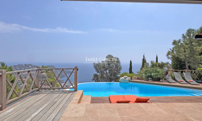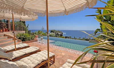 Holiday Rental : Superb modern villa offering high standards fittings and located in a private domain in Théoule sur Mer, with total privacy and enjoying panoramic sea views. Beaches, restaurants, Théoule and La Napoule villages are easily reachable by foot. The villa is composed of a triple living room with TV area and sofa facing the sea, dining area and a bar, all opening onto the terrace with infinity pool. The modern and equipped kitchen is opened onto the living room and leads to the terrace. An en-suite bedroom with its shower room is located on same level. Upstairs, 2 beautiful en-suite bedrooms, including the master bedroom, open onto a spacious terrace overlooking the swimming pool and the bay of Cannes. 2 more en-suite bedrooms with their shower room and opening onto the outside are located on the ground floor. Fully air-conditioned villa. TV in every room. Pétanque field. Double garage. Administrative fee: 45€ Tourist tax: 5,36€/person/night Services available on request: -Pets ( subject to the agreement of the owner ) : 10€/night -Baby cot: 55 € -High chair: 30€
