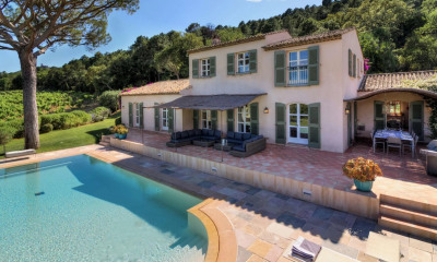 Discover this beautiful Provençal-style villa nestled in the heart of vineyards, offering an exceptional setting for relaxation and shared moments. Interior layout: The villa is spread over two levels: Ground floor: a spacious living and dining area with a cozy fireplace for warm, convivial moments. A fully equipped open kitchen (fridge, stove, dishwasher, coffee machine, and toaster) with an adjoining laundry room. Bedrooms: a double bedroom with TV, a bedroom with a single bed and office corner, and a connecting shower room. First floor: three charming double bedrooms, including one with a single bed, each with their own shower or bath/WC, perfect for accommodating guests. Independent studio: A charming separate studio featuring a kitchenette, a double bedroom, and a shower/bathroom, ideal for guests or independent use. Exterior: Enjoy a large, lush garden with a pool (optionally heated). A summer lounge is available for convivial meals with family and friends. Practicality and comfort: The villa offers private parking spaces and breathtaking views over the vineyards. Located in a secure estate, it is close to the entrance of Saint-Tropez and its beaches, combining safety and accessibility. Experience unique moments of happiness and serenity in this exceptional property. High season check-in/out: Saturday to Saturday (minimum 7 nights) To be paid on site: security deposit and tourist tax Registration number: 83065000489QU