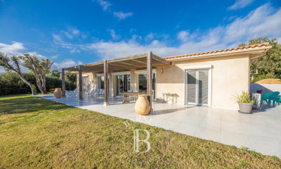 Exceptional location for this 180 m² villa located on 5,000 m² "waterfront" land with direct pedestrian access to a beautiful sandy beach. Completely renovated and air-conditioned, it offers: Main level: Entrance with guest toilet. Living room with fireplace and TV opening onto the terrace and the garden. Fully equipped kitchen. Cellar and laundry room. Upper half-level: A bedroom opening onto the garden; bathroom with basin, shower and WC. A maid's room. Higher level : Three bedrooms with TV and bathroom opening onto a terrace with panoramic views of the sea, the swimming pool and the garden. Independent WC. Outdoor space: Terraces of 300 m² including a shaded summer kitchen with electric plancha, lounge areas. Petanque. 8 x 3m heated swimming pool secured by an alarm.