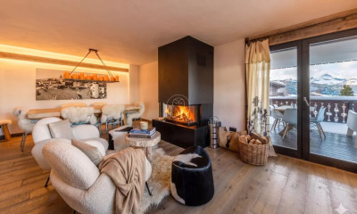 Located on the top floor of a sought-after residence in Mont d'Arbois, this rare apartment boasts an exceptional ski-in/ski-out location, bordering the golf course. With a Carrez Law area of 118.83 sqm and a total living area of 163 sqm, it offers generous proportions and a warm atmosphere. Upon entering, a well-appointed hallway with a guest toilet leads to a superb living space. This comprises a double living room, one with a fireplace, and a welcoming dining room. The fully equipped open-plan kitchen blends seamlessly into the space, creating an ideal area for entertaining. The entire living area opens onto a large, sun-drenched west-facing terrace with unobstructed views of the surrounding peaks. The sleeping quarters offer three en-suite bedrooms, including a spacious master suite, combining comfort and privacy. Upstairs, a converted mezzanine can accommodate an office or library and provides an additional space perfect for relaxation or reading. A rare opportunity in Megève, combining a prime location, high-end amenities, and direct access to the slopes. * A real gem! LAYOUT LEVEL 0 - An entrance hall with guest toilet - A double living area, one lounge with a fireplace, and a dining room - An open-plan fitted kitchen - Access to a large west-facing terrace - Three en-suite bedrooms, including a master suite LEVEL 1 - Access to a mezzanine used as an office OUTBUILDINGS - A cellar - A golf locker - A ski locker - Two garages