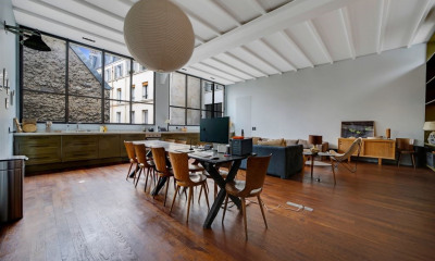 Exclusive - Paris 11 - Oberkampf - In absolute calm, sheltered from view, located on the 2nd floor with elevator of a building from the end of the 19th century, bright and not overlooked, this sublime apartment, rare in this environment, offers exceptional volumes (3.4 m of hsp). In perfect condition, its surface area is 165 m2 carrez. It includes: a large double living room, an open fitted and equipped kitchen, a master bedroom, two other bedrooms, an office, a complete bathroom, a shower room with WC, a guest WC.