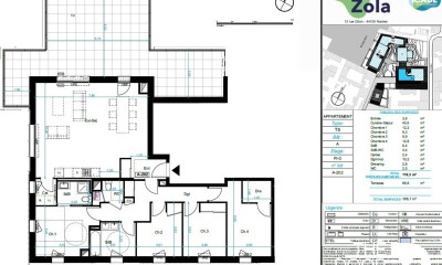 With south-west exposure this new apartment89 m² (about 957 ft²) contains 4 rooms including 3 bedrooms and 1 bathroom. It is equipped with a None, with a terrace and with a parking lot. It's located on the 3rd floor with a lift. Others : digicode.