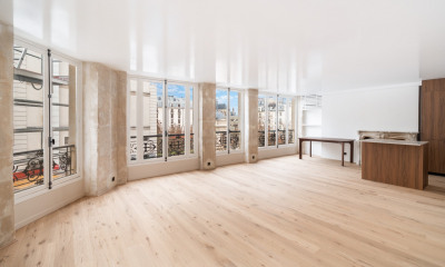 Ideally located in the heart of the 1st arrondissement, close to Rue du Louvre and Les Halles, this bright duplex is on the 1st floor of an old building. With a total surface area of approximately 107 m², it consists of a first level of 68 m² and a mezzanine of 39 m².@ Upon entering, the property impresses with its beautiful 4.70-meter ceiling height, herringbone parquet flooring, and large windows providing pleasant light. The warm living room opens onto a fitted kitchen. A first bedroom is located on the main level, as well as a bathroom, built-in closets, and a pantry. Upstairs, the mezzanine houses a second bedroom and an office space, accessible via a wrought iron staircase. This apartment with its optimized layout and atypical character is a rare property in this sought-after neighborhood, combining volume, functionality and old-world charm.