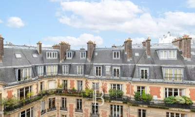 FAUBOURG SAINT HONORE / PARC MONCEAU. ABSOLUTE QUIET - On the top floors with elevator of a beautiful stone building, we offer for sale an apartment of 134.46 m² on the ground (including 113.62 sq m Loi Carrez) in duplex. It consists of an entrance, a large south-east facing living room overlooking the courtyard in peace, a dining kitchen, three bedrooms with UNOBSTRUCTED SKYLINE VIEWS, a bathroom, two separate toilets, and plenty of storage. Ideal for a family looking for a house-like apartment, in absolute quiet and very bright! Close to all shops, schools, and transports. Parking available for sale additional to the price.