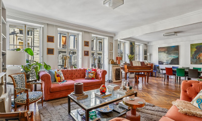 With south exposure this apartment107 m² (about 1150 ft²), built in 1900, in a building of 7 floors contains 5 rooms including 3 bedrooms, 1 bathroom and 2 toilets. It is equipped with a living room 30.54 m² (about 328 ft²), with dining room, with a None and with a cellar. It's located on the 2nd floor with a lift. Heating : Individual radiator. Others : intercom, digicode, parquet floor, fireplace. Fees : 3.