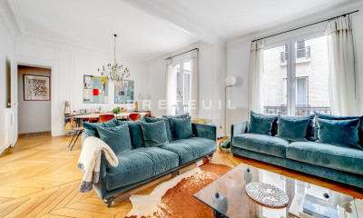 Porte Maillot – Boulevard de Dixmude Nestled on the 3rd floor of a superb 1930s Art Deco building constructed of cut stone, with a concierge, entry code system, and video surveillance, this elegant 98 sqm (1055 sqft) apartment combines period charm with high-quality amenities. It comprises a spacious entrance hall leading to a light-filled double reception room, facing west and offering unobstructed, verdant views. The separate kitchen faces the dining room. There are two large bedrooms (17 sqm/183 sqft and 14 sqm/151 sqft), a dressing room, a bathroom, a laundry room, and a separate toilet. Solid wood flooring, moldings, and a generous 2.80 m (8 ft 11 in) ceiling height give the apartment a unique character, blending Parisian elegance with contemporary comfort. A cellar completes this property. Located just steps from the Porte Maillot metro and RER station, close to the shops on Avenue des Ternes and the Palais des Congrès convention center. The District group comprises five agencies ideally located in the most prestigious neighborhoods of Paris: Île Saint-Louis, Saint-Germain-des-Prés, the Champ de Mars, the Golden Triangle in the 8th arrondissement, and Parc Monceau. Since 1997, we have offered a range of carefully selected and enhanced properties, along with a comprehensive suite of high-end services (sales, purchases, rentals, and property management).