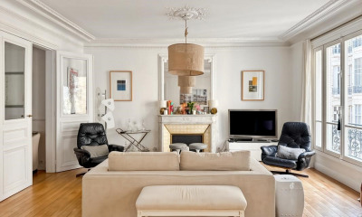 Ideally located in the heart of Passy's many shops, transport facilities and renowned schools. On the sixth floor, served by elevator, of a pleasant mid-twentieth century luxury residence, secure and planted with trees, superb air-conditioned family apartment with a surface area of 128.15m² loi Carrez, in absolute calm and unoverlooked, tastefully renovated and benefiting from an exemplary floor plan and sunshine thanks to its south-west orientation. Entrance hall, vast reception room, dining area, open-plan fitted and equipped kitchen, two large bedrooms (possibility of 3 as originally), including a master suite with en-suite shower room and toilet, bathroom, guest toilet, dressing room and plenty of storage space. Original three-bedroom configuration. Cellar.