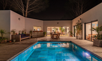 Just 10 minutes from Aigues-Mortes, nestled in a haven of serenity within the exceptional setting of the Petite Camargue, this unique property offers a perfect blend of natural charm and contemporary design. The bright and welcoming house features a spacious open-plan living and dining room, a large kitchen with a pantry, and a master suite with a shower and dressing room. Upstairs, there are four spacious bedrooms, a large office opening onto the living room, a bathroom, and a shower room. Travertine, stone, metalwork, concrete, tadelakt plaster, and sliding glass doors come together harmoniously. For your guests, a charming independent studio apartment with a shower room completes the high-end amenities of this property. Outside, a dream awaits in complete privacy: you will discover a flower garden with the beauty of the surrounding vineyards and ponds as a backdrop, a perfectly integrated 8 x 3.5m Roman-style swimming pool, a summer kitchen, a lounge, a bar, and several outbuildings. Surrounded by vineyards, this property is a true haven of peace, designed for those who love tranquility and beautiful spaces. Located between the villages of St Laurent d'Aigouze and Aigues-Mortes, it is less than 15 minutes from the beaches and 20 minutes from the TGV train station and Montpellier airport. ENERGY RATING: C (125) CLIMATE RATING: A (5) Estimated average annual energy costs for standard use, based on 2021 energy prices: between EUR2,350 and EUR3,210 including the subscription fee. Information on the risks to which this property is exposed is available on the Géorisques website: www.georisques.gouv.fr