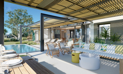 Discover this luxury villa, located in a golf estate on the east coast of Mauritius, nestled between the green mountains and the crystal clear lagoon. This secure estate extends over 213 hectares of tropical gardens and 6 km of shoreline and includes two 5* hotels with top-of-the-range services and an 18-hole golf course. This beautiful single-storey villa of 223 m2, located on a plot of 1715 m2 by the sea within one of the two 5* resorts, is composed of 2 en-suite bedrooms. Recently renovated, its living spaces decorated in a chic tropical style, open outwards and overlook a covered terrace and a private swimming pool, ideal for cooling off while admiring the lagoon which is at the end of its magnificent landscaped garden. . By acquiring this property you will be able to benefit from all the 5* services and benefits of the hotel and its expertise in rental matters since this villa is part of its rental inventory.