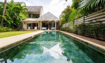 Discover this stunning 195 m² villa located in an exclusive golf estate on the east coast of Mauritius. Nestled between lush green mountains and a crystal-clear lagoon, this secure 213-hectare estate offers a unique lifestyle with its tropical gardens, 6 km of shoreline, two 5-star hotels with premium amenities, and a renowned 18-hole golf course. Ideally situated just 5 minutes’ walk from the resort’s amenities and the golf clubhouse, this villa impresses with its spacious layout and welcoming atmosphere. On the ground floor, you’ll enjoy a bright living area comprising a lounge, dining room, and a modern open-plan kitchen, opening onto a covered terrace designed for embracing the tropical lifestyle. The private garden, complete with a swimming pool, offers stunning views of the golf course. Upstairs, the villa features three en-suite bedrooms, including a master suite with a private balcony and an outdoor shower, ensuring comfort and privacy for the entire family. This exceptional property is ideal as a primary residence, a holiday home, or a rental investment. By becoming the owner, you will also qualify for permanent residency, a rare opportunity on the island. Don’t miss the chance to live in such an exceptional setting. Contact us today to arrange a visit and discover this unique gem!