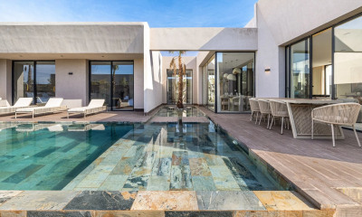 The Villa Ibera is a beautiful single-story villa, located in one of the most fashionable districts of the Ochre City. An ultramodern facade of 90 m: the architectural bet was daring, but thriving. This property located just a stone's throw from the city cannot be summed up in this first sentence. It is the result of a long reflection that allowed the rigidity of a large concrete and glass rule to harmoniously coexist with the curves of a strategically hilly park. The work's creator wished to create two totally different spaces but with a common philosophy: well-being. On the park side, an immense playful space, with a swimming pool and its integrated Jacuzzi, an aquatic bar highlighted by a colored sail, separates the three main suites, the large living rooms, the kitchen, and the plantations. On the courtyard side, three other rooms on the one hand, and a spa and a gym on the other, enclose a second swimming pool, this one heated. For more information, or to arrange a visit, don't hesitate to contact us.