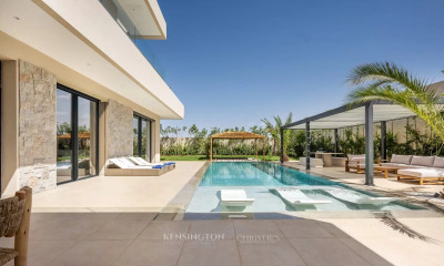 In the Argan golf course just a few minutes from the city center, this recent villa is in the front line with an unobstructed view. It includes an entrance, a generous reception area open through large bay windows to the pool and garden, a fitted kitchen, and a bedroom on the ground floor with a shower room. The upper floor, served by a beautiful bright staircase, features 4 spacious bedrooms with closets and a bathroom. The rooftop accommodates the technical area and a laundry room.