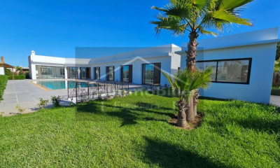 Vaneau Morocco, real estate agency in Casablanca and Marrakech, offers for sale this 649 m² villa located in a sought-after residential area of Casablanca. LOCATION 15 minutes from downtown Casablanca, within a secure residence with green spaces. Close to amenities: healthcare facilities, international schools, shopping centers, restaurants, and sports facilities. THE PROPERTY Contemporary villa with 475 m² of living space spread over two levels, set on landscaped grounds with swimming pool. Autonomous irrigation system via artesian well. GROUND FLOOR - Reception area with Moroccan lounge and dining room equipped with fireplace - Large bay windows overlooking the garden and pool - Equipped kitchen with adjoining pantry - Powder room and guest facilities UPPER FLOOR - Four bright bedrooms with private balconies - Master suite with bathroom and dressing room - Sliding bay windows to optimize natural light AMENITIES - Air conditioning in all rooms - Exterior lighting - 24/7 residential security - Access control - Video surveillance system ADVANTAGES Family property in a secure environment, combining modern comfort and privacy in a desirable area of Casablanca. Property sold with clear title - Agency fees: 3% additional to the sale price
