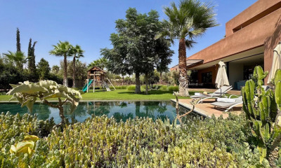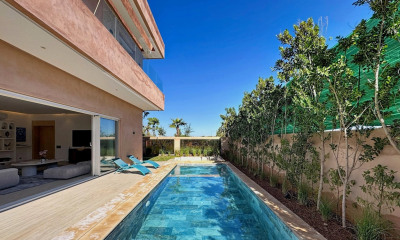 In the heart of Agdal, boasting magnificent views of the Atlas Mountains, this brand-new villa is being sold furnished. The spacious rooms are very comfortable, and the villa is bathed in sunlight. A beautiful terrace opens onto the swimming pool (pre-installed for a heat pump). The entrance hall leads to a double reception room and a cathedral-ceilinged living room, a fully equipped kitchen, and a guest toilet. Both levels are accessible via an internal elevator. On the first floor, there are three bedrooms, including a master suite with a dressing room and bathroom. The basement includes a cinema room and bar, a fourth bedroom with a shower room, and a laundry/staff room. There is also a toilet and a utility room. A lovely rooftop terrace awaits development. A 55-meter well ensures water conservation.