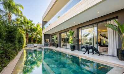 Designed to blend harmoniously into an exceptional natural environment, these 18 single-storey villas feature modern, uncluttered architecture. Each villa is unique. Carefully designed by renowned architects, they offer generous interior volumes bathed in light, opening onto terraces, patios and gardens. The harmony between modernity, clean lines and noble materials creates warm, functional and timeless living spaces. These villas are built on a 1,009m² plot and offer 330m² of living space. An entrance hall, a spacious double reception room with fireplace and bay windows opening directly onto the swimming pool. A fully-equipped open-plan kitchen (wall and base units, worktops, integrated appliances) opens onto the living room to create a fluid, convivial space. Four en-suite bedrooms with private bathrooms, including a master suite with dressing room. Private swimming pool: 11 m x 3.50 m, south-facing. Gardens: large green spaces with decorative Japanese gardens. Terraces: direct access from all living room and suite windows. An upscale residential project combining elegance, comfort and absolute serenity.