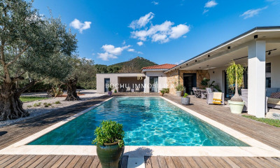 In a quiet environment, with an open view this house (Contemporary house) 149 m² (about 1602 ft²), built in 2023, with a land size of 985 m² (about 0,24 acres) has 3 rooms including 2 bedrooms and 2 toilets. It has a Fitted kitchen/dining room, a garage and 2 parkings. Heating : Reversible airconditioning.