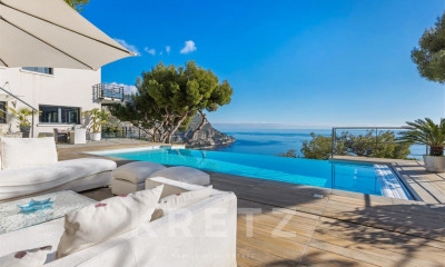 Located in Èze Bord de Mer, just 10 minutes from Monaco, this semi-detached villa, whose interior needs to be refurbished, offers an attractive living environment, combining a privileged location, tranquillity and great potential for personalisation. Set on a plot of approximately 2,500 m², of which 1,500 m² is dedicated to the villa (the rest being for the neighbouring villa), this villa has a surface area of approximately 400 m². The construction and exterior landscaping work is fully completed, including a landscaped garden, large terraces and neat fencing, blending harmoniously into the Mediterranean environment and offering unobstructed panoramic sea views. The interiors remain to be finalised, allowing the future buyer to furnish the large spaces according to their wishes and comfort requirements. The villa, built on four levels, offers large living areas, four bedrooms, and planned amenities such as an indoor swimming pool, a wellness area with spa, and a cinema. Bathed in light, the villa enjoys a peaceful environment, with very few neighbours and easy access. Comfort is enhanced by a large enclosed garage that can accommodate 5 to 6 vehicles, as well as two outdoor parking spaces under pergolas. It is also possible to purchase the neighbouring villa, creating a 670 m² property with 16 rooms, built on 2,500 m², for €6,800,000. Complete file and 3D visuals available on request.