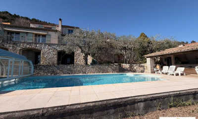 Amazing panorama overlooking the village, the Bay of Cannes, the Esterel Hills, and Lake Saint-Cassien, for this superb traditional Provençal house, very well built and organized around six main rooms (219.24 m²) and with the added possibility of creating an extra room (37.28 m²). Lot of annexes, such as; solariums, double garage, wine cellar, pool, summer kitchen, terraces and parking area. South exposure, enclosed land (2639 m²) with olive trees. At walking distance to the village. Deserve to be seen.