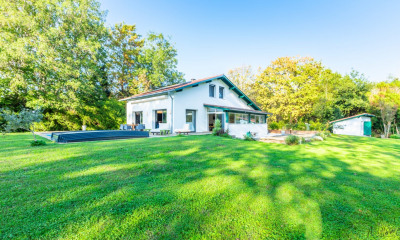 Situated in a quiet location close to the center of Ahetze, on an approx. 1,800 sqm plot, this beautiful single-storey house has been very well maintained. It features a beautiful entrance hall with cupboards, a living room with fireplace and air conditioning, a dining room, an independent fitted kitchen, a scullery, a laundry room and a toilet. The night area includes a master bedroom with dressing room opening onto the garden, a full bathroom and a bedroom with shower room. Upstairs are two further bedrooms with fitted closets, and a shower room with WC. A laundry room and a garage converted into a bedroom and office provide additional sleeping space if required. The house is completed by a beautiful 10x5m heated swimming pool. Pool house with Jacuzzi, shower, WC and summer kitchen. The villa is surrounded by a delightful garden planted with trees.