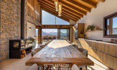 Dominating its surroundings, this 196.79 m² chalet unfolds like a private lookout over three living levels, topped by a mezzanine. As the centerpiece of this exclusive development, it sits on a plot of approximately 550 m² where stone and reclaimed wood harmoniously blend with the modern edge of shuttered concrete. The second floor, the true heart of the home, features a 77 m² cathedral living room bathed in light. This reception area opens onto a kitchen with a pantry and extends out to a panoramic terrace, inviting the mountain peaks to your table. A mezzanine overlooks this space, offering an intimate retreat or a home office suspended above the lounge. The sleeping area, spread across the lower levels, has been designed for both privacy and togetherness. The first floor distributes four elegant bedrooms, including three with double beds, complemented by two shower rooms for uncompromising comfort. Information on the risks to which this property is exposed is available on the Géorisques website for the areas concerned. Interior photos are non-contractual (architectural staging projections). Your contact: Yohan SABROU 06 58 37 19 75