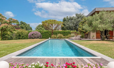 With east-west exposure this house (Contemporary house) 247 m² (about 2655 ft²), built in 2008, with a land size of 3839 m² (about 0,95 acres) comprises 8 rooms including 4 bedrooms, 2 bathrooms and 3 toilets. It is provided with a Fitted, with a swimming pool, with a terrace, with 2 garages and with a cellar. Heating : Individual. Others : fireplace.