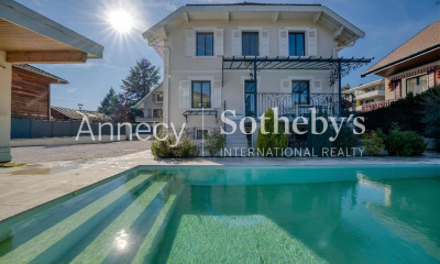Perched on the heights of Annecy-le-Vieux, just a stone’s throw from the lake and the highly sought-after area of the Petit Port, this stunning villa enjoys an exceptionally privileged setting, offering absolute peace and quiet along with beautiful views over the lake and Annecy. Built on a plot of approximately 1,100 sqm, the property offers 295 sqm of usable space spread over three levels. The interior features generous volumes filled with natural light, with large openings to the outdoors that fully embrace the surrounding panorama. The villa opens onto a spacious living area comprising a double reception room and a separate fully equipped kitchen, both leading onto a large terrace with a swimming pool. On the same level, the sleeping area includes three bedrooms, a dressing room/office, and a bathroom. Upstairs, there are two additional bedrooms, an office, and a shower room. On the lower ground floor, a cellar. Large garage. Laundry room. Boiler room. Several outdoor parking spaces. Carport. Information on the risks to which this property is exposed is available on the website georisques.gouv.fr. Agency fees payable by the seller.