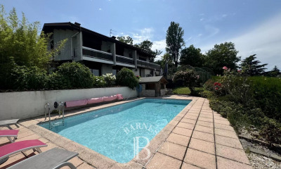 EVIAN SOTHEBY'S INTERNATIONAL REALTY offers a 1970s house of approximately 243 m² spread over two levels in the town of Évian, offering a magnificent panoramic view of the lake. The ground floor comprises an entrance hall, a kitchen, a living room with a wood-burning stove, three bedrooms, a toilet, a bathroom, a laundry room, and two cellars. Upstairs, you will find a second entrance hall, a fitted kitchen, a living room with a fireplace, three bedrooms, two toilets, and a shower room. The outbuildings include a garden shed, a double carport with a workshop, a swimming pool, and a charming mazot (a traditional farmhouse). EVIAN SOTHEBY'S INTERNATIONAL REALTY, YOUR EXPERT IN THE SALE OF LUXURY PROPERTIES I