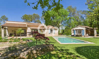 Charming 3 bedroom single story villa, only 10 minutes from Fayence village with lovely pool and in great condition. There is a generous entrance, an office area, large open-plan and fully equipped kitchen and built in dining area with high ceilings giving a really spacious family kitchen. Leading off the kitchen and living room is the most beautiful covered terrace with BBQ area, overlooking the pool (8mx6m) and the hills beyond. There is a fireplace in the living room and large concertina doors leading outside onto the covered terrace. The bedroom wing has the master en-suite with shower room and toilet and 2 other double bedrooms with family bathroom with shower and toilet. From the entrance you can access the laundry room with fitted cupboards which leads into the good sized garage. A really great house for full time living or as a holiday home which is ready to enjoy, so don't miss out! A real gem!