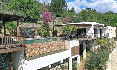 A stone's throw away from the village of Seillans, this 3,394 square meter property offers a beautiful panorama of the wooded plain of the Fayence region, punctuated by vineyards and picturesque hamlets. The house, with a living area of 119 square meters, provides a comfortable living space with modern interiors and high-end amenities. It consists of a living-dining room with double-height ceilings, a fully equipped kitchen, and three bedrooms with en-suite bathrooms. It is enhanced by two south-facing covered terraces. Additionally, there is a swimming pool and a large garage. Close to all amenities, the Fayence-Tourrettes aerodrome, and the Terre Blanche golf course, this property offers a peaceful atmosphere just a stone's throw away from picturesque villages.