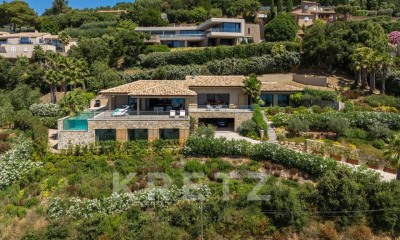 Unique in Grimaud, exceptional villa offering one of the most beautiful sea views in the Gulf of Saint-Tropez. Out of sight, this 350 m² property rests on a 2212 m² green park overlooking the bay of Saint-Tropez. The villa houses a large living room extended by a large terrace with an infinity pool offering a breathtaking sea view. A pleasant covered terrace for lunch by the swimming pool, a flat garden with Mediterranean scents and its numerous relaxation areas with different atmospheres will allow you to enjoy sunny days by the sea. The villa has five bedrooms arranged in suites overlooking the the sea, each with private bathrooms and dressing rooms. Among its luxurious services, you will find: wine cellar, fitness room, cinema room, equipped laundry room, 85 m² garage and large outdoor parking space. A true haven of tranquility in the heart of the Gulf of Saint-Tropez.