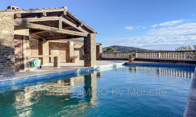 Close to Saint-Tropez and just a short walk from the village of Grimaud, this beautiful renovated Provençal house of approximately 250 m² is set on a flat plot in a quiet area with a south-facing orientation. The property offers comfortable living spaces, including an entrance hall with guest toilets, a living room with a fireplace, a bright dining room, a fully equipped separate kitchen, and a TV lounge. On the ground floor, there is a bedroom with an ensuite shower room, as well as a master suite with a bathroom, dressing room, and an office that can be converted into an additional bedroom. Upstairs, two bedrooms share a bathroom with a shower and a dressing room. An independent studio with a kitchenette and shower room completes the property, making it perfect for hosting guests. The fully enclosed and well-maintained garden features a heated swimming pool and a pool house with a bar and kitchen. A greenhouse houses a jacuzzi, creating a relaxing space. A double garage adds to the appeal of this property. Bien situé dans une zone soumise à l'obligation de débroussaillement