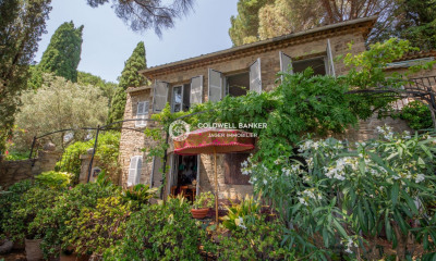 This house at the foot of the centre of Grimaud is easily accessible and offers beautiful views. The orientation is south. The house comprises two separate living units. Each living unit has its own terrace. On entry level you will find a kitchen with dining area and access to a spacious terrace, a living room, a toilet and a shower room. Upstairs you will find a spacious bedroom with fireplace, plenty of cupboards and a shower room. From here you enjoy panoramic views. On the garden level you will find an apartment with a spacious living room, an open kitchen with bar and a dining room. There is also a sleeping area. A staircase leads to a spacious bedroom with a modern en suite bathroom. The plot is spacious and offers beautiful views. A unique green corner in the village with many possibilities for investors or double occupants.