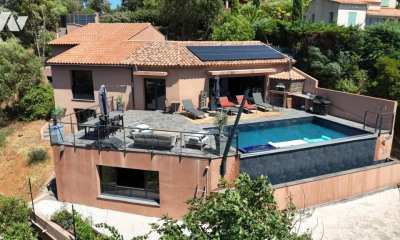 With an open view and south exposure this house (Luxury villa) 140 m² (about 1505 ft²), built in 2014, with a land size of 1225 m² (about 0,30 acres) contains 4 rooms including 3 bedrooms, 2 bathrooms and 2 toilets. It is equipped with a living room 45 m² (about 484 ft²), with a Fitted kitchen/dining room, with a swimming pool, with a terrace, with a garage and with 2 parkings. Fees : 3.88.
