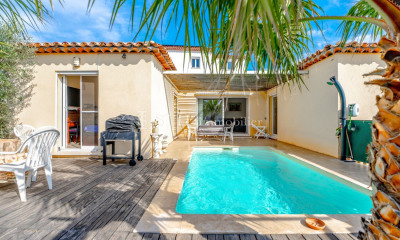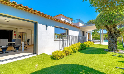 Villa for sale in Sainte-Maxime. Located in the quiet and sought-after area of Sémaphore, superb recent property with magnificent views of the sea and the Gulf of Saint-Tropez. Built with high-end materials, it is composed of: Reception hall, cloakroom and guest toilet, large living-dining room opening onto terrace and patio with fountain, fitted kitchen with cold room, 3 bedrooms each with shower room and dressing room, laundry room and large garage. A swimming pool adorns the beautifully wooded garden.