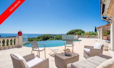 Perched in an elevated position, this fully renovated villa offers superb sea views and enjoys a full south-facing exposure. It stands out for its high-end finishes, exceptional brightness, and remarkable comfort of living. The main living area consists of an open-plan kitchen, fitted with granite countertops and terrazzo flooring, featuring premium furnishings and a layout designed to combine conviviality and practicality for everyday life. The light-filled living and dining areas open onto a covered terrace offering a splendid view of the Mediterranean. Finishes are particularly refined, with solid wood flooring and matching doors. The windows, framed with Egyptian stone and fitted with mosquito screens, reflect the meticulous attention to detail, while a functional laundry room and abundant storage space further enhance comfort. The master suite, with a full bathroom and WC, also boasts a custom-made dressing room and direct access to the terrace, which is fitted with illuminated awnings that automatically adjust to the sun's movement. A second bedroom, with its own shower room, is ideal for accommodating a child on the same level. On the garden level, a self-contained 42 m² apartment includes a living room with kitchen, a shower room, a bedroom, and a WC. Two garages, totaling 66 m², offer the possibility of creating an additional en suite bedroom by partitioning a 24 m² area. The heated swimming pool, perfectly integrated into a setting of local vegetation, measures a comfortable 8 x 4 meters with a depth of 1.50 m—ideal for play and relaxation. The fully enclosed and impeccably maintained grounds feature a water borehole and allow for the parking of several vehicles inside the property, which is accessed via an automatic gate. Villa for sale through Janssens Immobilier, Sainte-Maxime. Information on the risks to which this property is exposed is available on the Georisques website : http://www.georisques.gouv.fr
