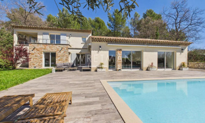 SOLE AGENT. In Seillans, a superb 260sqm modern villa (2008), ideally situated on 3300m2 of enclosed land. Elevated above a landscaped garden, where large stone walls meander, and where old olive trees, palm trees, and oaks coexist. Superb traditional swimming pool with wooden deck and integrated jacuzzi. The house is divided into two parts, connected by a covered entrance (porch), the main part to the south, and an independent apartment to the north. On the main side, the house offers an entrance hall leading to the living and dining area. Large bay windows, a central fireplace, and high ceilings. On the other side, a large open-plan kitchen, giving access to the covered terrace on the east side. Pantry. To the right of the hall, a ground-floor guest bedroom with dressing room and bathroom. Upstairs, the master suite with a monumental bathroom (shower and bathtub) and sleeping area. Private outdoor terrace. The independent apartment consists of a living room-kitchen, two independent bedrooms, and a shower room/toilet. The whole property is equipped with reversible air conditioning, designed according to modern criteria, using high-end materials (stainless steel, wood, large tiles...), offering 3 outdoor terraces, a large and comfortable pool area, a basement offering large storage spaces. Electric gate and enclosed land, pétanque court... An ideal place for family enjoyment of the advantages of the Mediterranean climate, without sacrificing comfort.