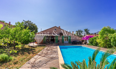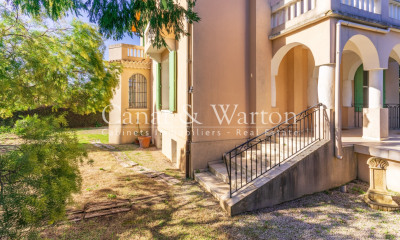A hillside villa in Toulon, south-east France, built on a 17th-century priory with vast wooded grounds and a sweeping view of the city's natural harbour. An electric gate marks the main entrance. You reach it via a steep lane with two bends that is around 100 metres long. Beyond the gate, on the left, there is a large, flat parking space for four vehicles. A shelter there offers space for three vehicles. At a lower level, there is a half-open second space where two other vehicles can be parked. A few steps take you up to a wrought-iron double-leaf gate that leads into a covered entrance area from where you enter the house. The villa, crowned with a roof of barrel tiles, has two floors, extended with terraces on three sides. It was entirely renovated in the early 1990s, then in 1998. Its one-metre-thick walls rendered with roughcast bear witness to the building's long history: the place was probably a priory that dated back to the 17th century - this is suggested by a millstone bearing the year '1630' that was found on the site. The south-facing house is rectangular, built upon the rocky hillside with a flat ground floor. It offers a floor area of around 280m². Its many sliding picture windows across its facade herald a bright interior bathed in natural light. These windows are fitted with electric roller shutters. The west gable wall is made of exposed pointed stonework. A niche in this wall houses two small statues of cherubs. A vast terrace in front of the south-facing facade of white rendering offers a spectacular vista of the city below and, beyond it, Toulon's natural harbour. On this terrace, you can relax in an infinity pool where you can admire an unrivalled view of the sea. On the left, two shelters offer shade and coolness in the summer heat. On the north side, two walkways lead to the first-floor terrace and the garden. The villa is surrounded by its vast wooded grounds on a slope.