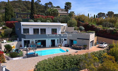 SOLE AGENT An exceptional waterfront property in Anthéor, on Corniche d'Or, between Cannes and Saint-Raphaël, in an ideal and well-exposed location, in a blind alley in a closed estate, in a nuisance-free environment, hidden from sight, with direct accesses to the sea. Surrounded by red rocks, the property, of modern architecture, offers a splendid panoramic sea view over the sea and the Esterel hills. The villa develops generous volumes with a living surface of 224 m², including in particular a large reception room opening entirely onto the outside and 3 large suites. The whole set on a manicured land of a surface of 1040 m² with heated jacuzzi and swimming pool, surrounded by the sea just like a peninsula. High-end amenities, reversible air conditioning, alarm system, sound system. Parking spaces. A rare location for this waterfront property with many assets.