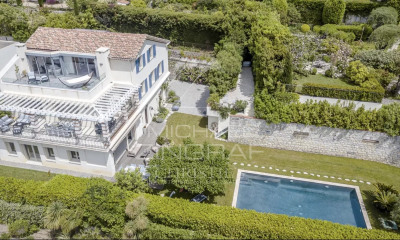 Renovated villa in a modern style, with a living surface of 255 sq.m, on a land of 902 sq.m. Situated in second line, in a dead-end street, away from traffic, this 5 bedrooms, 5 ensuite bathrooms, south exposed, is only a few minutes walking distance from the Garoupe beaches. - Living, dining room as well as open kitchen on the pool level - 3 bedrooms on the garden level with direct access to the garden, pool - Master bedroom and another bedroom on the upper level - Accessible roof top / solarium - Covered car port for two cars The house is equipped with quality materials, reversible A/C, alarm, and is ready to move in.
