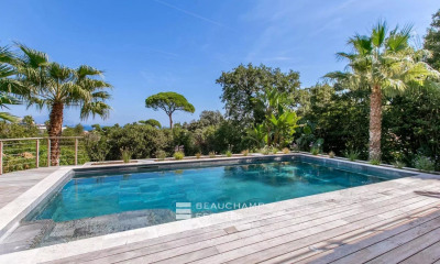 Built on a 1,218 m² plot with a swimming pool, this fully renovated contemporary villa offers 320 m² of living space. With its spacious rooms, it has 6 bedrooms, each with a shower room or bathroom. Located in a quiet, private estate, it enjoys a privileged location close to beaches, amenities and the Cap d’Antibes. Panoramic sea views, a roof terrace and ample parking complete this exceptional property.
