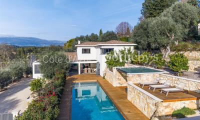 Nestled in the heart of Mougins on a private estate, this 367 m² Provençal stone country house on a 2,626 m² plot enjoys a privileged location just two minutes from the shops and within walking distance of the restaurants of the old village. Situated in a commanding position, it offers panoramic views over the Bay of Cannes to the Esterel hills. The living spaces are arranged around large, bright spaces at pool level, faithful to Provençal architecture with their arches and openings, while benefiting from a modern and functional layout. Upstairs, the four comfortable bedrooms enjoy panoramic views of the Bay of Cannes and the sea. A pool house converted into a bedroom with a bathroom and kitchenette, as well as a separate two-room apartment, complete the property, providing dedicated spaces for guests or staff. A large basement is converted into a storage area and laundry room. Outside, the property opens onto a landscaped garden featuring local trees and a heated indoor swimming pool. A carport for three vehicles, several parking spaces, a vegetable garden, and a children's area with a wooden structure create a true haven of peace. This country house, located in a beautiful Mougins area, offers extensive development potential, allowing you to personalize it to your liking and further enhance its exceptional character. Property not subjected to condominium regulations Annual fees : about 700€ Energy class : D (236KW)- Climat class : D (45KG)/ estimated annual costs for standard use : between 5,262 € and 7,120 € (ref year 2021). Information on the risk to which this property is exposed is available on the Geohazards website : www.georisques.gouv.fr.