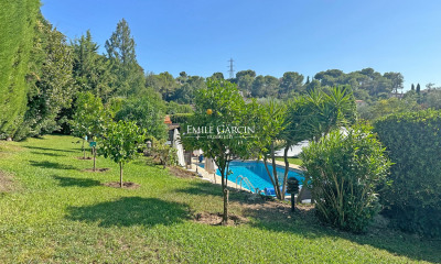 Mougins - Notre-Dame-de-vie. 350 m2 family villa set in approx. 2300 m2 of greenery with swimming pool. First floor: living room with fireplace, exposed beams, dining room with stone wall, open-plan fitted kitchen, patio in the center of the villa with magnificent tropical plants, protected terrace with sea view, south-facing. Master bedroom ,Guest bedroom Upstairs, a master suite with terrace overlooking the sea and the old village of Mougins. 2 other bedrooms and 2 bathrooms in marble Office opening onto a terrace overlooking a Mediterranean garden with vines and olive trees and the Picasso house. Independent studio Workshop. Laundry room . Cellar. garage. parking for two vehicles. 1km from shops and restaurants. 15 minutes from the Croisette beaches and 30 minutes from Nice airport.