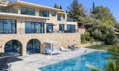 This villa, located in a green setting with views of the old village of Mougins, has been completely renovated. With a surface area of approximately 430 sqm, it comprises an entrance hall, a superb cathedral-ceilinged living room with fireplace and library area, a dining room and a large kitchen with utility room. The mezzanine offers a beautiful office space and a suite with shower room. The ground floor also includes a very spacious master suite with bathroom with shower and dressing room. On the garden level, there are two large guest suites. You will discover a landscaped garden of 3,500 sqm with a large swimming pool and numerous terraces. A garage for two vehicles completes this property. Located 35 minutes from Nice Airport and 40 minutes from Monaco. Energy rating: B (95 kw - Climate rating: A (3 kg) / estimated annual energy costs for standard use: between £2,637 and £3,567 (reference year 2021). Information on the risks to which this property is exposed is available on the Géorisques website: www.georisques.gouv.fr.