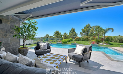 PIERRES-BLANCHES IMMOBILIER - THE EXPRESSION OF LUXURY Nîmes - PBI Collection In the heart of this sunny provincial town, we stroll through a garden where the aroma of colourful flowers and the rounded shape of the surrounding hills seem to have stopped time. We discover the nuances of this fabulous garden with its relentless softness. As we explore this architect-designed villa, with its 190 m² of living space stretching over 2200 m² of wooded garden, we are drawn into a state of contemplation in which the poetry of everyday life seems to have found refuge. The architecture and decoration are treated with as much subtlety as delicacy. We immediately grasp the strong architectural narrative, emphasising the purity of the lines and the sobriety magnified by the aesthetic sense punctuated by rare details, where a cutting-edge selection of furniture and design objects have taken their place as a matter of course. The reception rooms and the open-plan kitchen of over 60 m² are illuminated by large picture windows, offering an unobstructed view of the horizon. The spotlight is on the living room, where the warm atmosphere is undeniably enhanced by the combination of mineral-toned materials and the sober lines of the Focus stove. On the ground floor, the villa features a 33 m² master suite with en suite shower room and dressing room, extended by a private terrace. Two junior bedrooms, a bathroom and a study complete the ensemble. The terrace leads to a number of areas dedicated to well-being, with exceptional settings that make this experience as soothing as it is memorable. The 5-metre-long pool follows, offering a glimpse of delicious moments to come. Benefits: Nîmes Collines Nord. Possibility of buying furnished. This 2022 renovation features all the finishing touches required for a prestigious property. Garage 28 m². Garden shed 20m². Jacuzzi. Close to the town centre. Our Opinion : L'Accent du Sud ® Beauty and simplicity in unison create an environment full of positive energy. ‘An authentic and contemporary vision of luxury real estate. Franck Ballester ® ANY INSPIRATION, MODIFICATION OR REPRODUCTION IS PROHIBITED - REGISTERED TRADEMARK File on references Contact +33 (0)4 67 70 07 87