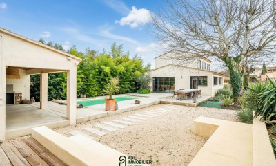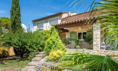 Just 15 minutes from Uzès, perched above a sought-after village where tranquility meets breathtaking scenery, this contemporary 170 sq m (1,830 sq ft) bastide overlooks the Pont du Gard and its majestic natural surroundings. A touch of Provence pervades the air. Dry stone walls, a garden planted with Mediterranean species, and the light dancing on the olive trees create a vibrant and authentic setting. At the heart of this verdant haven, a swimming pool invites relaxation under the generous sun. From the moment you enter, the house reveals an open-plan living space bathed in light. The spacious living room flows seamlessly into a modern kitchen, separated by a glass partition with timeless charm. Underfloor heating, air conditioning, and electric shutters: comfort and elegance are perfectly combined here. Facing south, the large sliding glass doors blur the line between indoors and outdoors, opening onto a shaded terrace with a pergola and the garden, where wood, stone, and light blend seamlessly. On the same level, a room of approximately 20 square meters can be used as an inspiring office or a peaceful guest room, depending on your needs. A master suite, a true haven, offers a dressing room, a bathroom with a shower and bathtub, and a soothing view of the garden. Upstairs, two generously sized suites each have their own shower room and toilet. A third bedroom and an office or library space complete this level, dedicated to rest and contemplation. A carport and a laundry room complete the property. Nestled in a serene yet not isolated setting, this house harmoniously combines modernity and a relaxed lifestyle. Just 15 km from Uzès, 10 minutes from the A9 motorway and 25 minutes from Avignon TGV station, this property offers a refined lifestyle, blending nature, light, and comfort. No work is required; simply unpack and enjoy the gentle charm of the South. Exclusively listed by Espaces Atypiques. Contact: Virginie 33 6 77 39 33 14. Energy rating: A / Climate rating: A. Information on the risks to which this property is exposed is available on the Géorisques website: www.georisques.gouv.fr