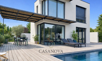 Castelnau-le-Lez – A beautiful contemporary home built in 2022, offering a peaceful and refined living environment. Located just five minutes on foot from the tramway and close to local shops, this villa boasts numerous desirable features. A spacious and light-filled living room, enhanced by large pocket sliding windows, is complemented by a fireplace with insert, creating a warm and inviting atmosphere. Three comfortable suites ensure both privacy and comfort. Ducted reversible air conditioning provides optimal well-being throughout the year. The property includes a heated saltwater pool, secured with an immersed electric cover. The fully landscaped 600 m² plot offers a pétanque court and a charming thatched pergola. Several terraces, both on the ground floor and the upper level, allow you to fully enjoy the elevated views. The garage, featuring generous ceiling height, offers the possibility of adding a mezzanine to create additional storage space or an extra room. A green space adjacent to the house is ideal for leisurely walks, adding an extra touch of serenity to this already peaceful setting. This quiet and beautifully designed home is a true opportunity for those seeking an elegant and functional residence.